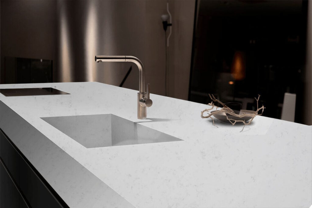 Soft white quartz inspired by Carrara marble offers timeless elegance and durability for tranquil or striking interiors.